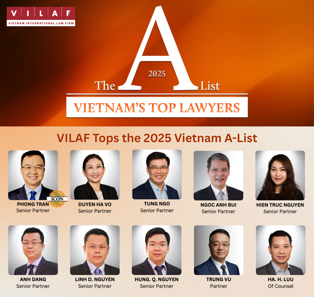 We are thrilled to share that 10 VILAF lawyers have again been recognized on the prestigious Vietnam A-List: Top 100 Lawyers 2025 by Asia Business Law Journal, the highest number of lawyers from any law firm in Vietnam on this elite list. Senior Partner Phong Tran is also recognized among the 12 Vietnam Legal Icons.